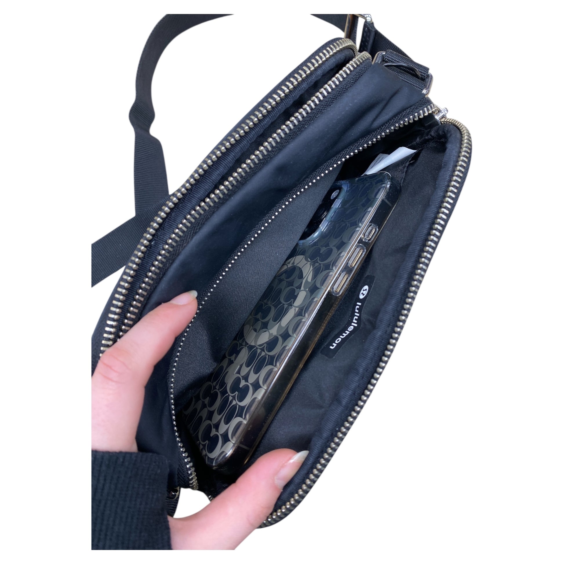 Chic black Lululemon handbag in small size exudes sophistication. Crafted with premium materials for timeless style and functionality. Elevate your look effortlessly.